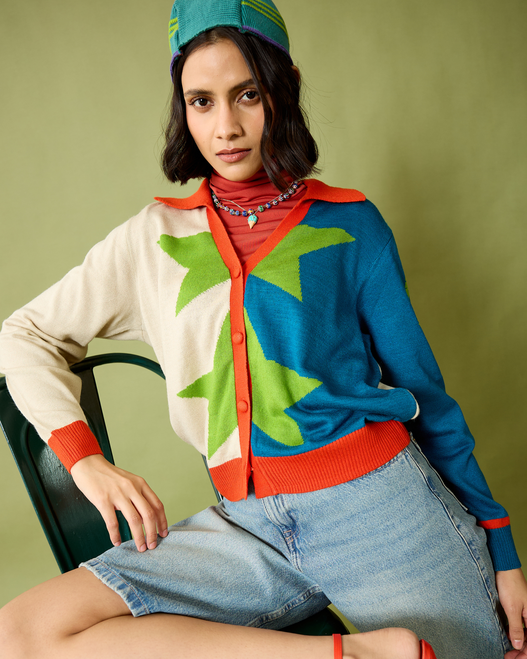 Crafted from premium jacquard knit, this shirt features a structured collar, a button-down front, and ribbed trims for a polished finish. The full-sleeve silhouette is adorned with bold abstract motifs and dynamic color blocking, creating a striking visual contrast.