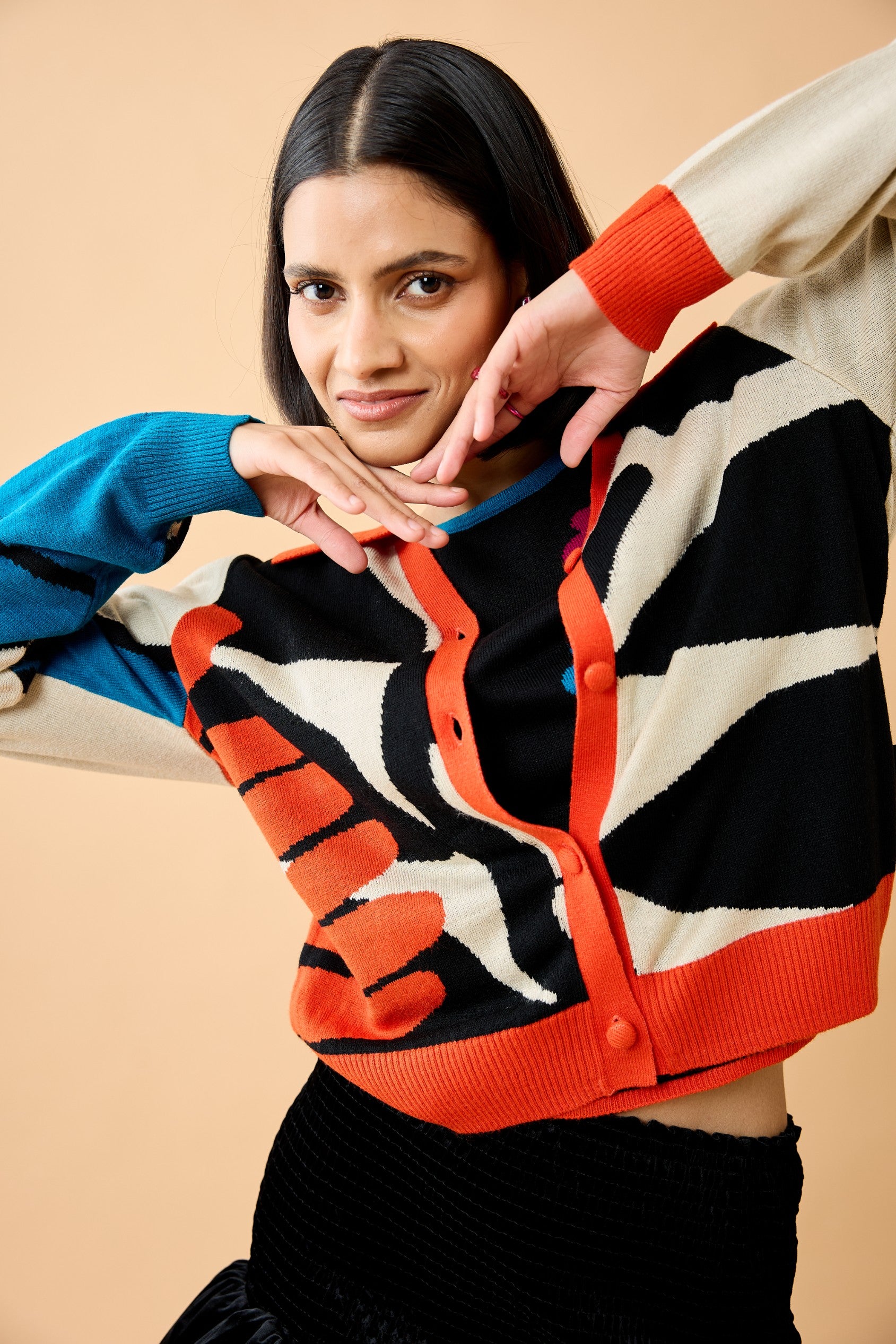 Crafted from premium jacquard knit, this shirt features a structured collar, a button-down front, and ribbed trims for a polished finish. The full-sleeve silhouette is adorned with bold abstract motifs and dynamic color blocking, creating a striking visual contrast.